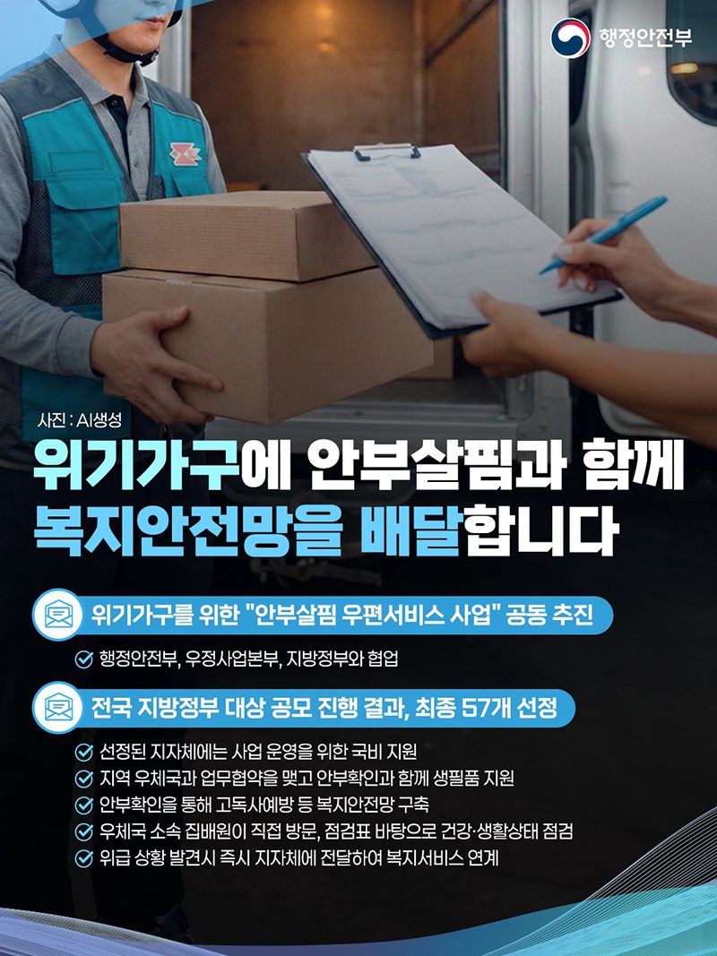 행정안전부는 우정사업본부, 지방정부와 협력하여 ‘안부살핌 우편서비스 사업’을 공동으로 추진한다. 전국 지방정부를 대상으로 공모를 진행해 최종 57개 지자체를 선정했으며, 선정된 곳에는 사업 운영을 위한 국비가 지원된다. 해당 지자체는 지역 우체국과 업무협약을 맺고 본격적인 서비스에 나선다.
